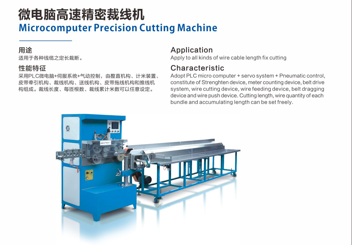 采用PLC微電腦+伺服系統(tǒng)+氣動控制,由整直機構(gòu)、計米裝置、皮帶牽引機構(gòu)、裁線機構(gòu)、送線機構(gòu)、皮帶拖線機構(gòu)和推線機